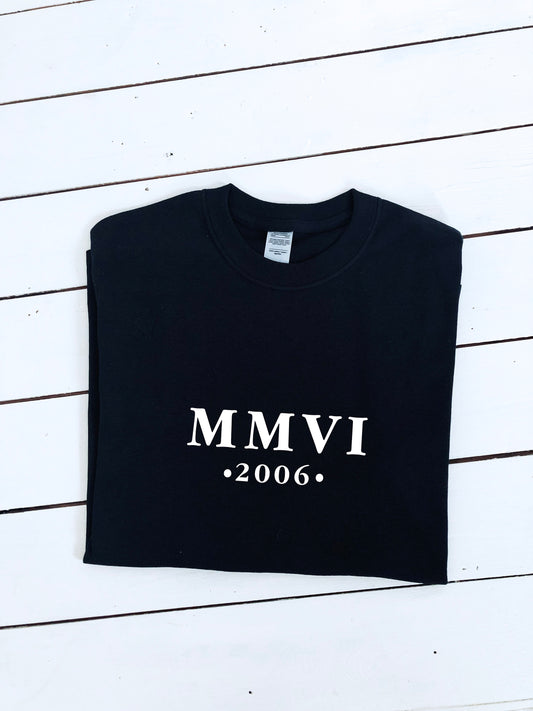 Custom Roman numerals year print T-shirt, multiple colour and sizes, mens and womens tops, kids sizes, personalised item, you select year